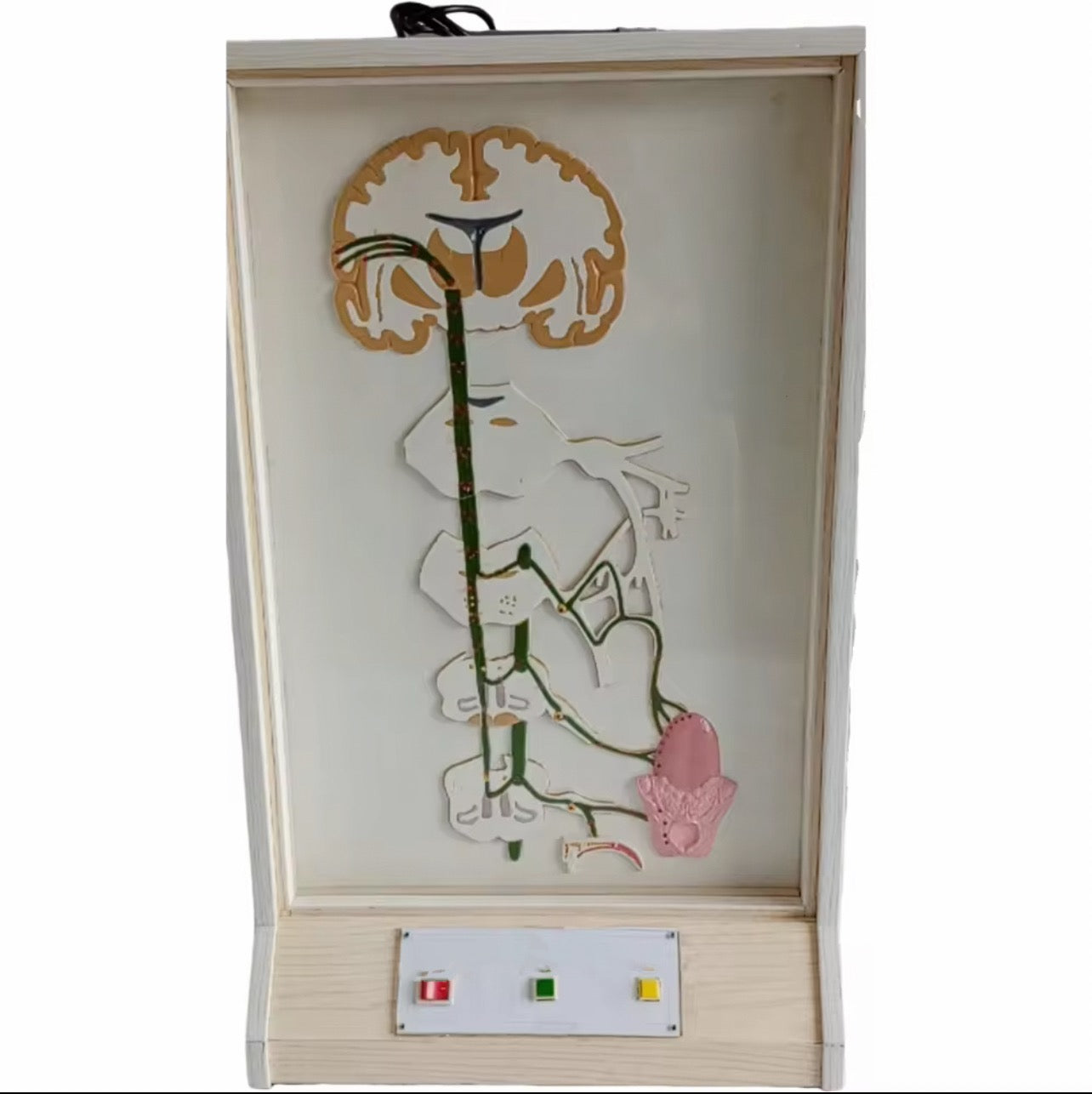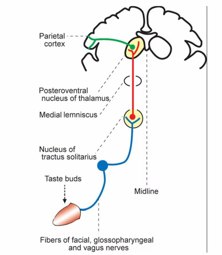 Tres nervios transportan señales gustativas al tronco del encéfalo: la cuerda del tímpano (desde la parte frontal de la lengua), el nervio glosofaríngeo (desde la parte posterior de la lengua) y el nervio vago (desde el área de la garganta y el paladar). Además, el nervio trigémino transporta señales del sistema de tacto/temperatura/dolor. Las señales gustativas se combinan en las áreas del tronco encefálico implicadas en la excitación (es decir, durante el sueño) y luego con las señales olfativas en el cerebro para producir la sensación de sabor.