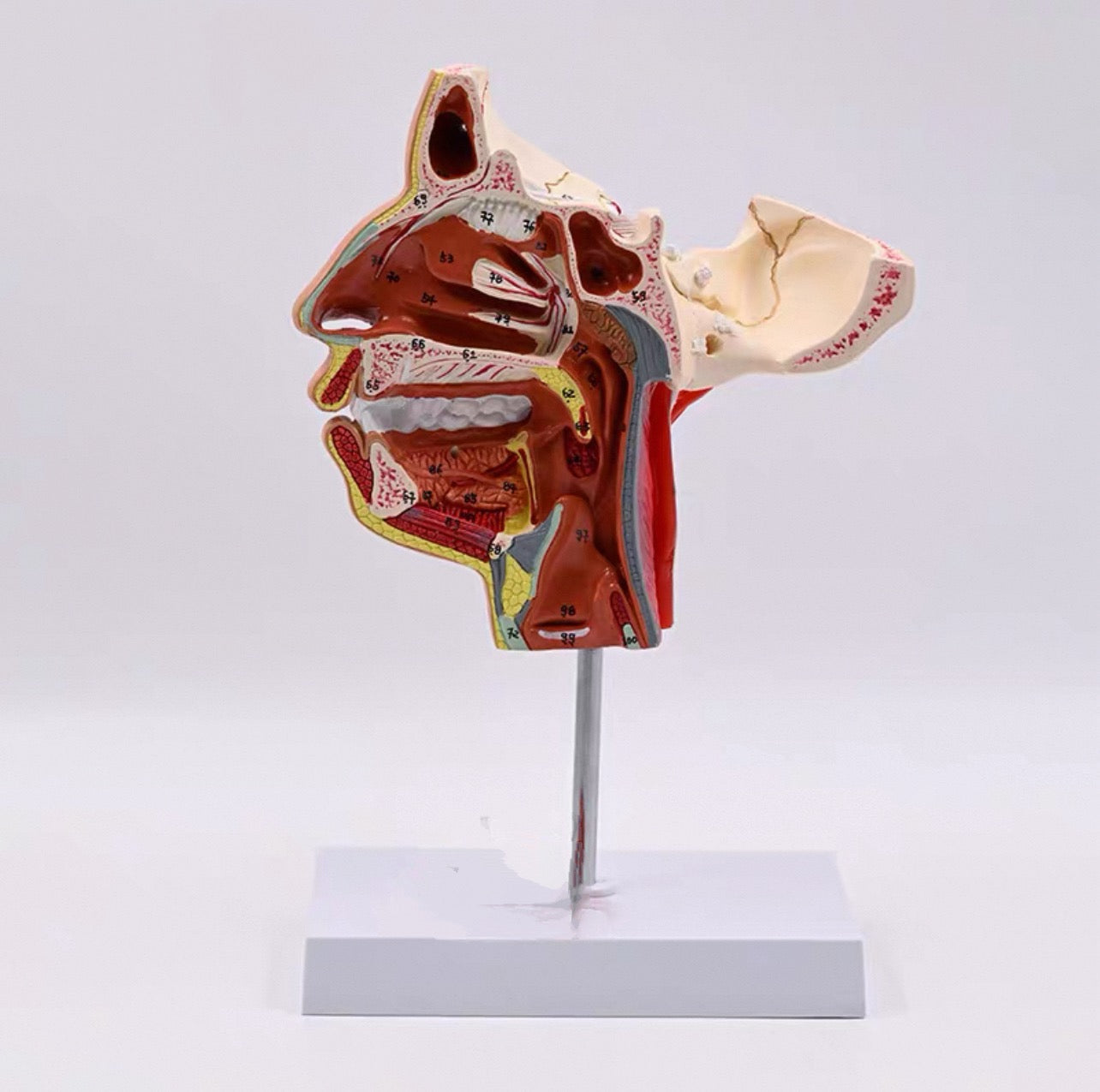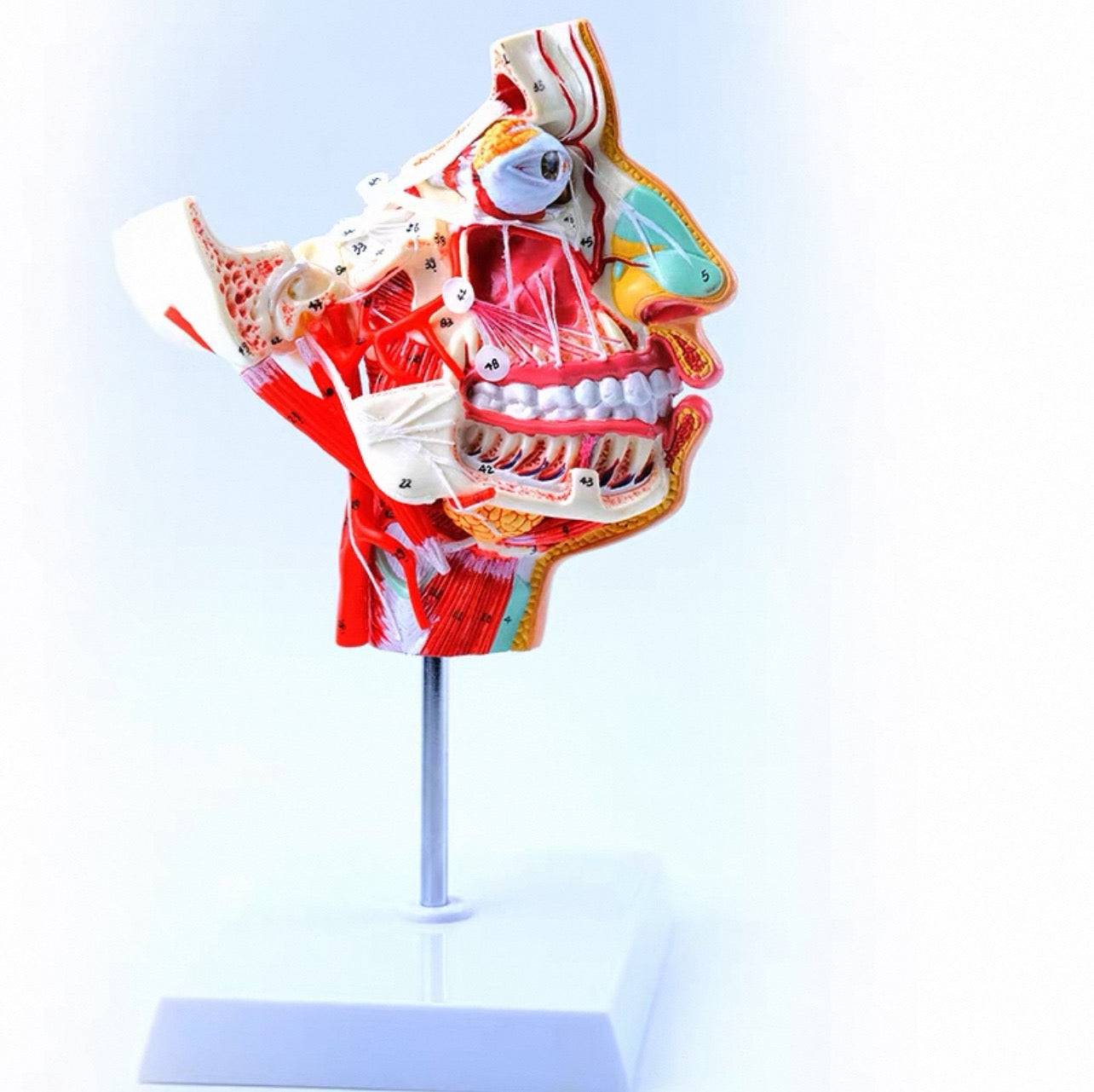 Modelo de cabeza media anatómica: el modelo muestra la forma de la cabeza y la cara y sus estructuras locales, como vasos sanguíneos y nervios. Detalles incluidos son los músculos de la cara expuesta, los vasos sanguíneos superficiales y los nervios de la cara y el cuero cabelludo y la estructura medial de la cabeza, el cerebro y las vías respiratorias superiores y la estructura transversal sagital de la columna cervical. Diseñado para brindarle una experiencia de aprendizaje práctica precisa y efectiva.