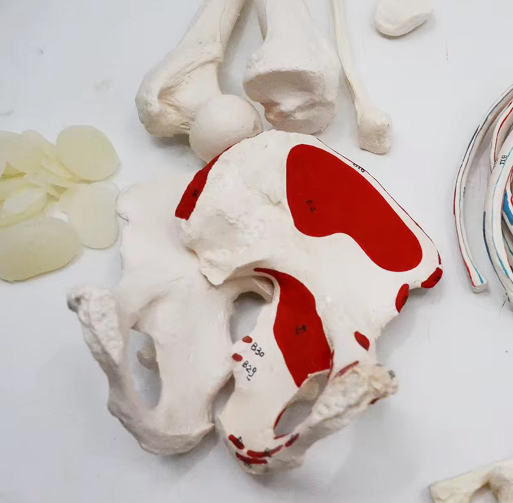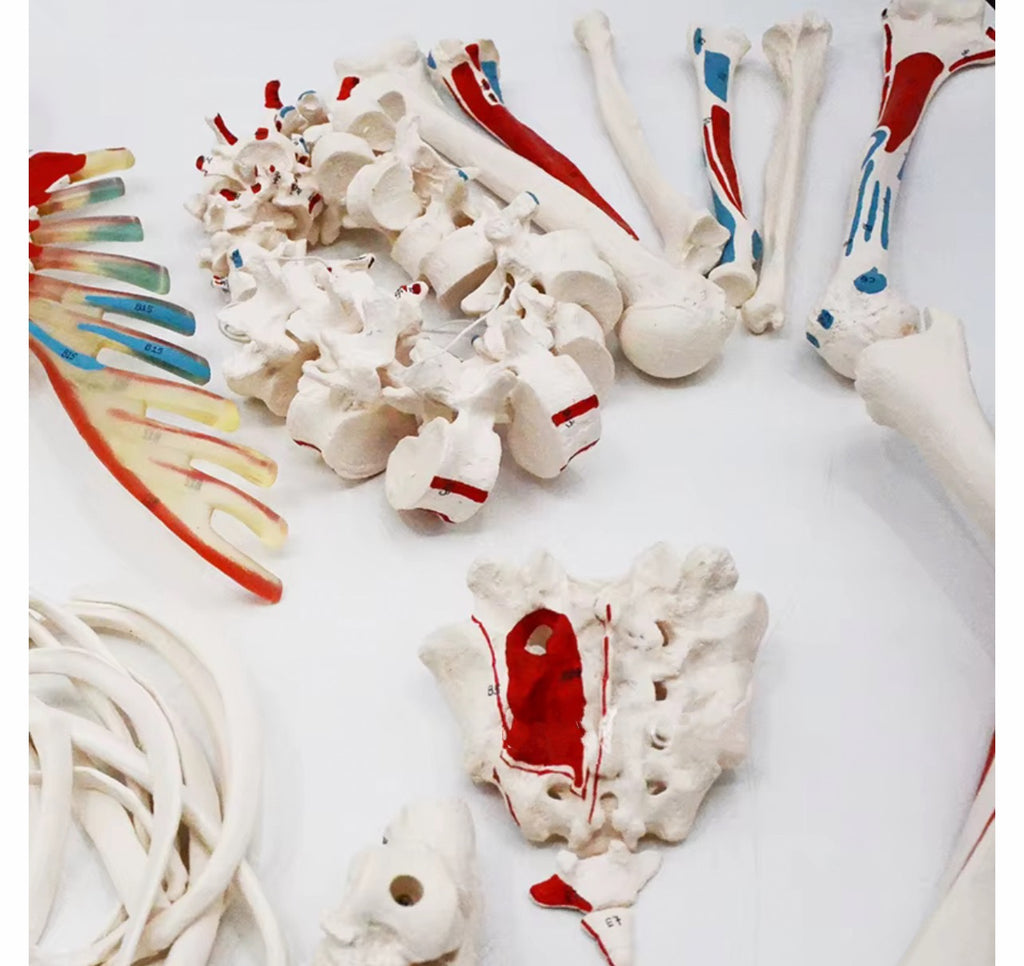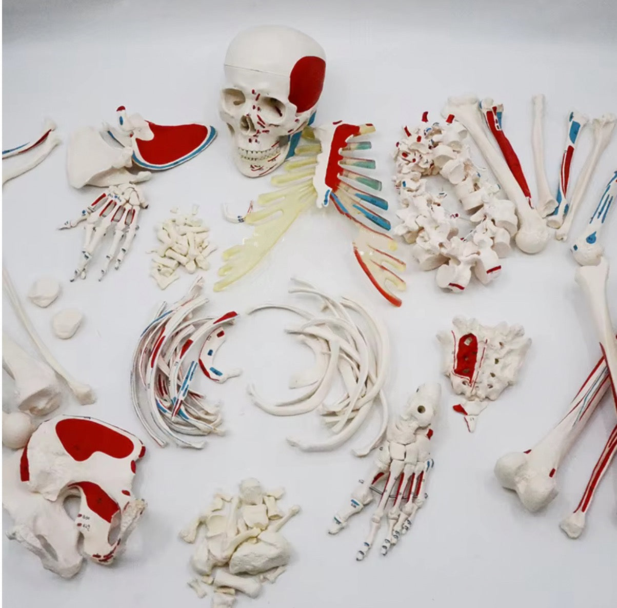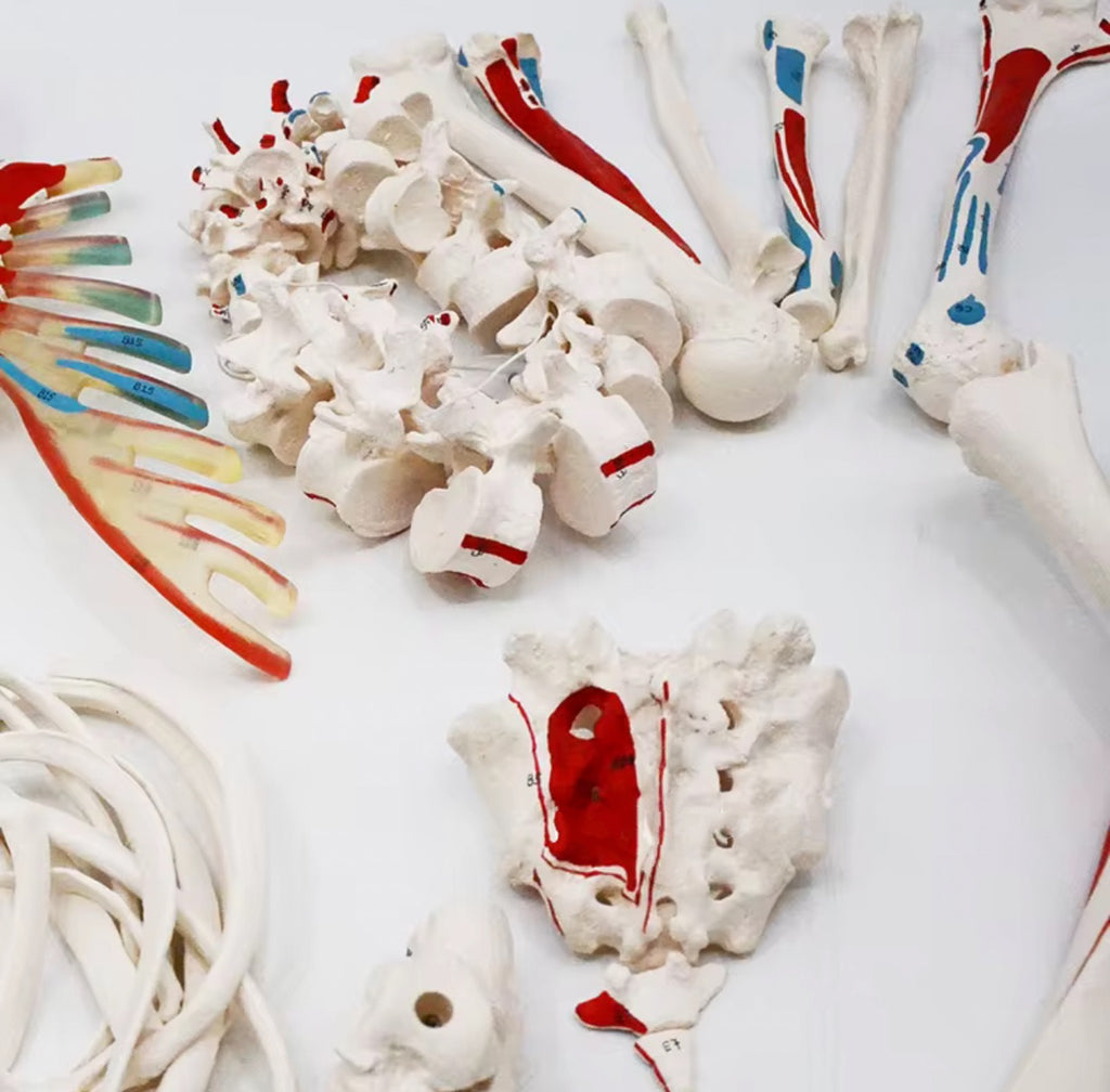 Este modelo a tamaño real muestra el esqueleto humano completo con sus huesos separados: cráneo, esqueleto axial, hueso hioides, costillas, esternón con cartílago costal, extremidades superiores e inferiores, sacro y cóccix, representados con gran detalle.