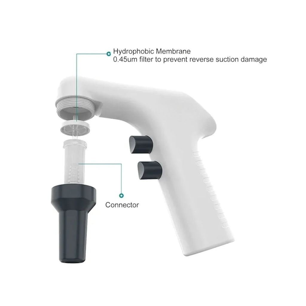 compatible con la mayoría de las pipetas de plástico y vidrio de 0,1 a 100 ml, puede llenar rápidamente 25 ml de líquido en 5 segundos, el filtro de 0,45 um y la válvula de seguridad pueden evitar daños debido a una inhalación excesiva.